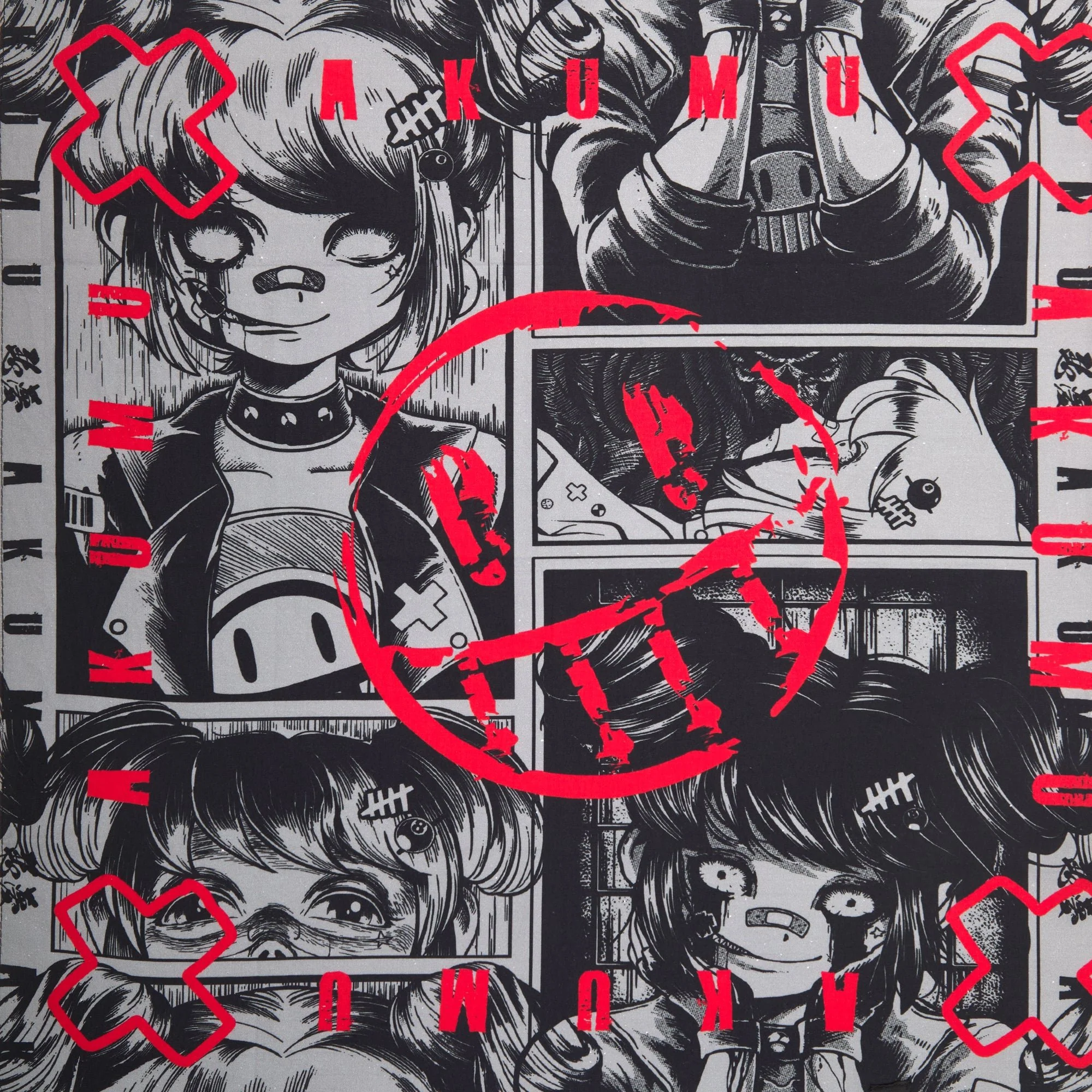 Black and Gray comic strip bandana with horror anime-inspired EM-J and Signature Smiley woven label. Printed graphics in red.