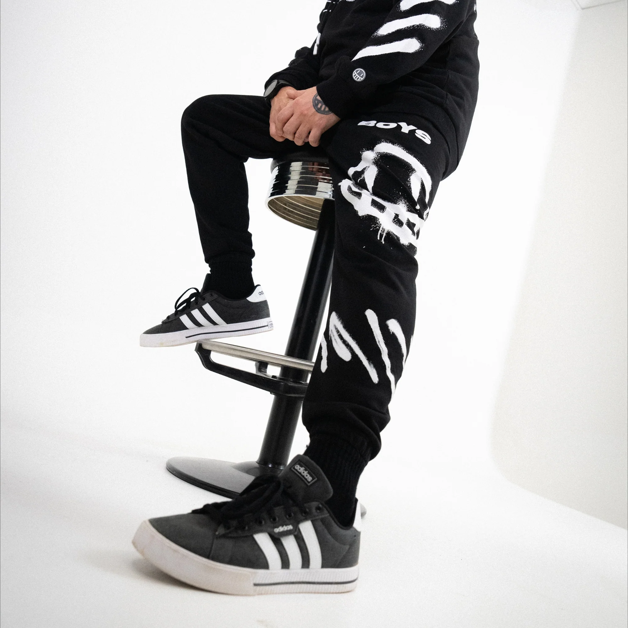Black tapered sweatpants featuring scattered graffiti screen printed graphics down the legs.