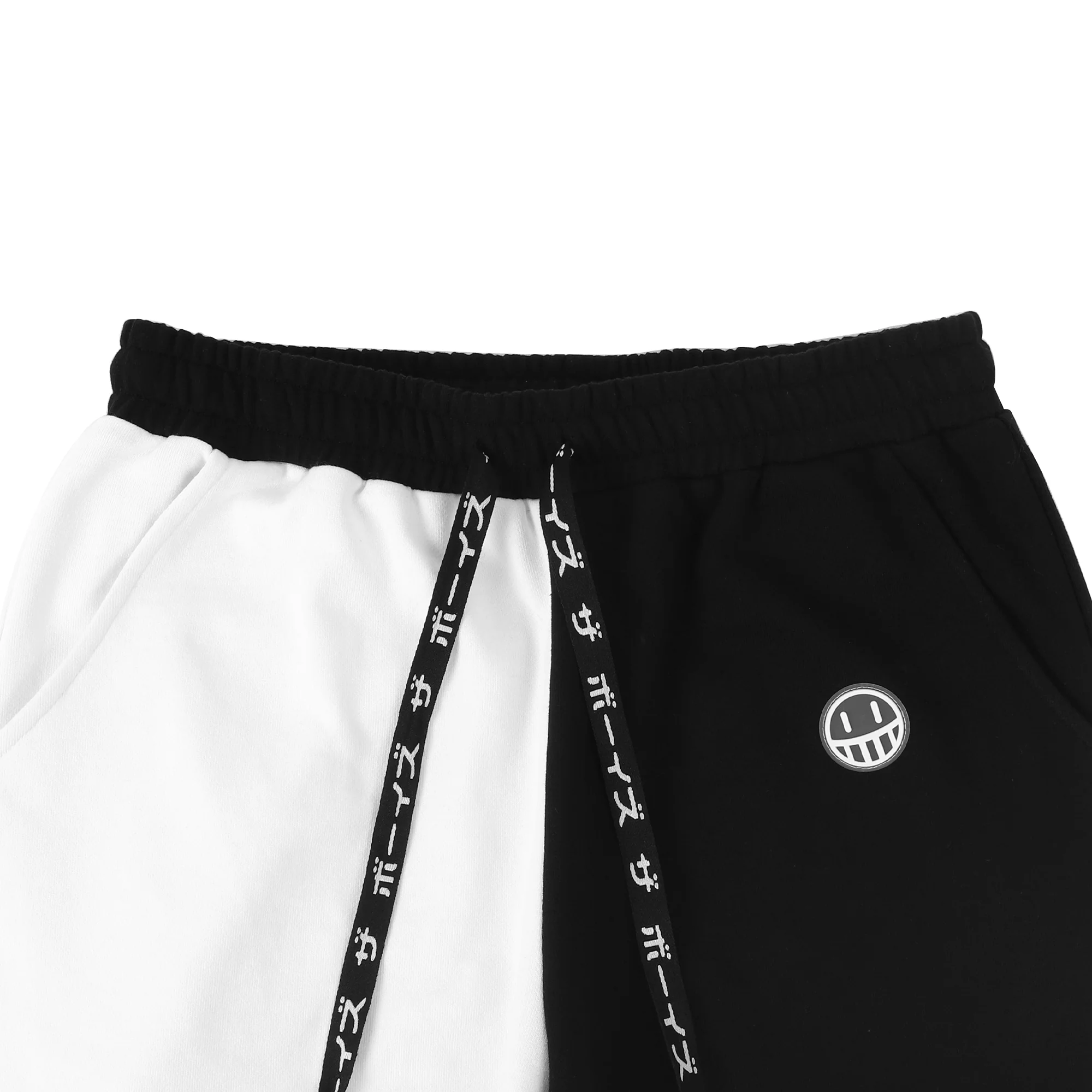 - Black & white colorblock sweatpants featuring Sucker Punch 2.0 graphics printed on the drawstrings, front and back pant leg, with a silicon smiley patch on pocket.