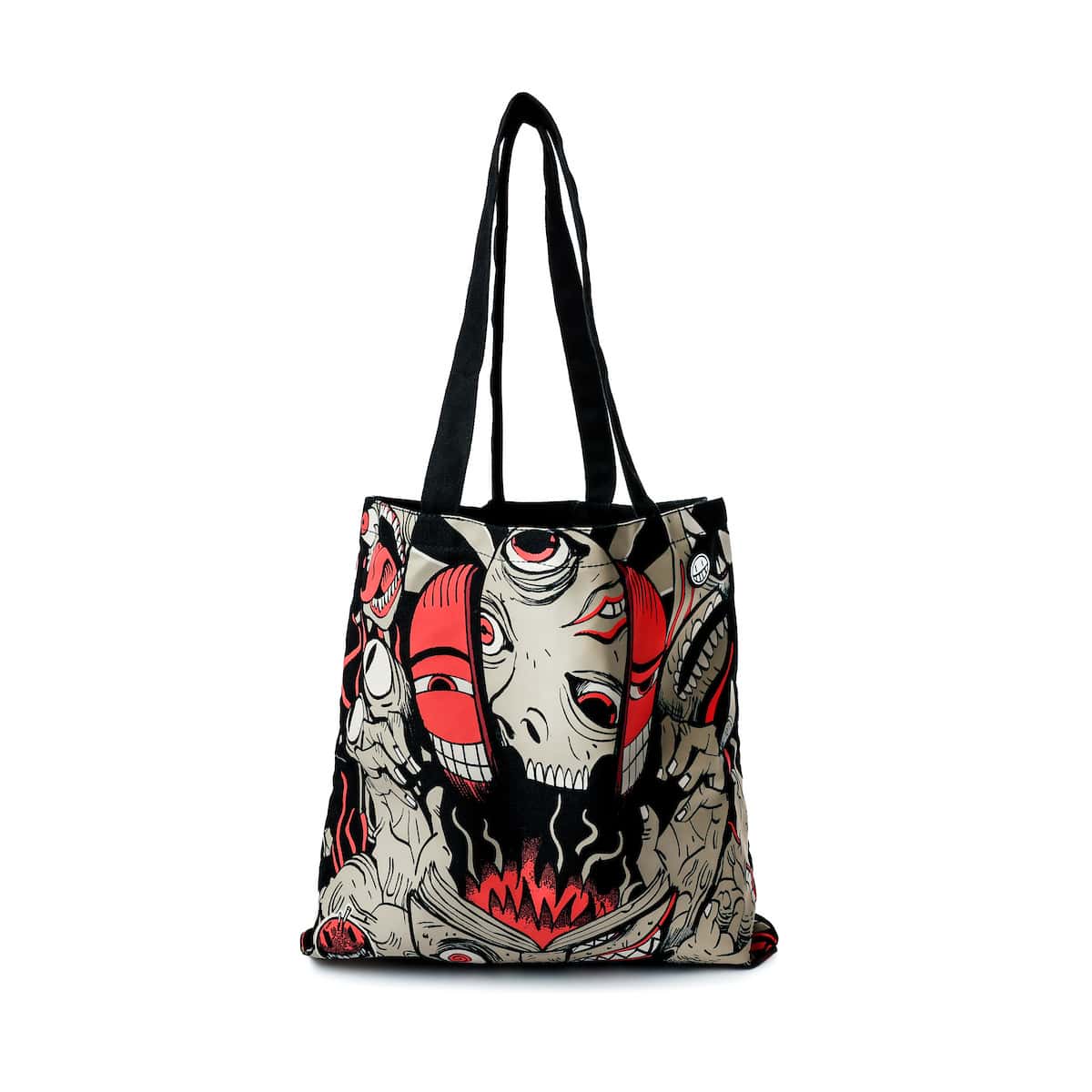 - Black tote bag with allover print graphics